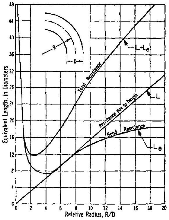 of the design configuration. Sometimes the increased resistance of a specific flow passage can be accounted for by assigning to it a fictitious or equivalent length , of straight duct which is arrived at empirically. The sum of this equivalent length and the actual passage length, ( ), is then used in equation (7-7) for the calculation of turbulent flow. Figure 7-21 presents typical resistance characteristics of bends.