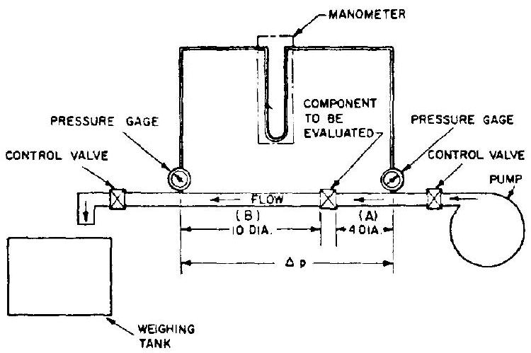 Figure 7-22 shows a typical test setup for fluid-flow-control components. Pressure taps are located 4 diameters upstream and 10 diameters downstream of the component to be evaluated. This minimizes the flow disturbances at the pressure tapoff points caused by the components. The combination of pressure gages, U-tube manometer, and weighting tank produces quite accurate and repeatable test data. The net pressure drop caused by the component is obtained by subtracting from the measured that pressure drop which is caused by an uninterrupted straight pipe of the same size and length diameters, at the same flow conditions.