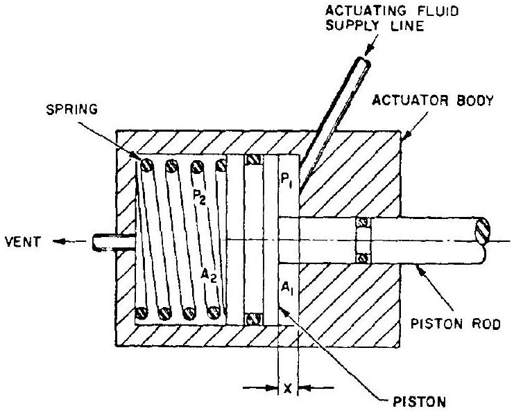 Figure 7-23 illustrates the schematic of a typical piston-type actuator for fluid-flow-control devices. The piston when actuated moves against the spring in the direction of the arrow. The basic correlation between the response rate or acceleration of the piston, and other operational parameters, can be expressed by