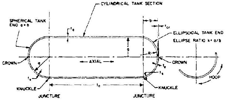 Figure 8-6 identifies the major tank elements. In an optimum tank design, the wall thickness varies according to a combination of local membrane, bending, and discontinuity stresses. This is especially true for the spherical and ellipsoidal tank ends. The structural calculation methods for volume, wall thickness, wall surface area, and weight of various tank shapes will now be discussed. The following general terminology is used: