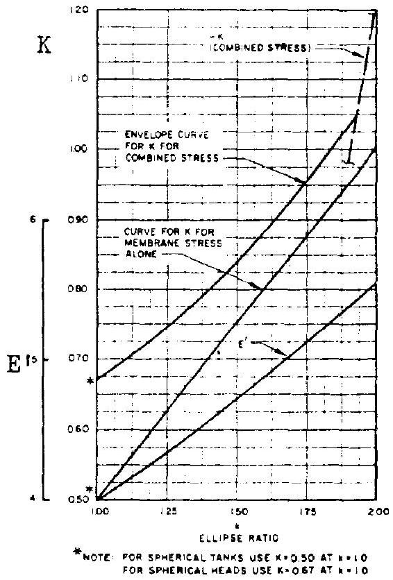 where k=k= tank end ellipse ratio =a/b;k=1=a / b ; k=1 for a spherical end R=R= tank end crown radius, in =ka;R=a=k a ; R=a for a spherical end K=K= stress factor, a function of the ellipse ratio kk. Figure 8.7 presents a KK versus kk curve for combined membrane, discontinuity, and local bending stresses tk=t_{k}= wall thickness at the knuckle, in tcr=t_{\mathrm{cr}}= wall thickness at the crown, in te=t_{\mathrm{e}}= equivalent wall thickness of an ellipsoidal tank end, in ts=t_{\mathrm{s}}= equivalent wall thickness of a spherical tank end, in tc=t_{c}= wall thickness of a cylindrical tank section, in (3) Wall surface area:
